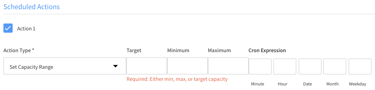 2. Choose the Action Type and enter any information required for the specific Action Type. For example, if the Action Type is Set Capacity Range, you enter the Target, Minimum, and Maximum.